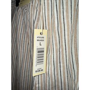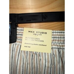 NWT Women's blended linen striped wide leg trousers from Max Studio London. Adjustable, elastic waistband with drawstrings for a perfect fit. Some rips on the inside of one leg as pictured. Originally $19.99. Size large. Exact measurements below.
