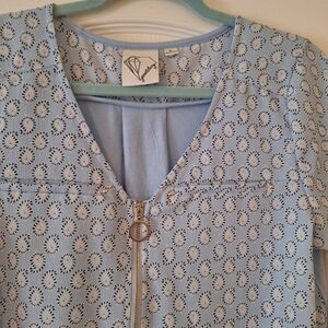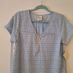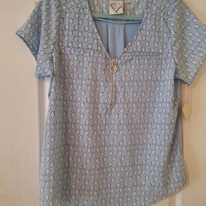 New with tags blouse. Blue print v neck with zipper. Solid blue back knit. Size Medium.