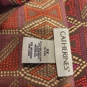 This NWT Women's Catherines Button up short sleeve shirt in size 3X features a geometric pattern in a multicolor design. The collared neckline with button closure makes it a versatile option for casual occasions during the summer, fall, and spring seasons. Made from a tag-removed material, this regular fit shirt is machine washable for easy care and is perfect for plus size women looking for a basic yet stylish addition to their wardrobe.