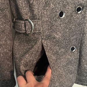 Stylish charcoal peacoat by INTL Details. Features double-breasted design and buckle accents. Adjustable at waist. Pockets on both sides. Removable hood. Perfect for chilly days.