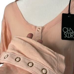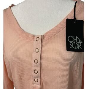 New With Tags Women's Chaser pink waffle knit half button front long sleeve top. Oversized fit. Round neck. Buttons at cuffs