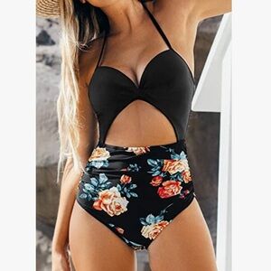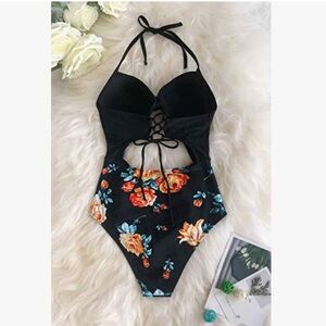 NWT. Women’s. Cupshe. Black floral cut-out one piece swim suit. Built in bra padding. Adjustable tie back straps. Size Small.