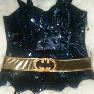 Awesome DC COMICS Batgirl complete Halloween costume medium/Large (6-14).New with tags.Smoke/pet free home.Sexy, quality made,great for all ages child,teen, tween,adults.Includes 1 NWT sequined Batgirl DC COMICS fitted corset with adjustable hook n loop closure on back. Strapless. Breast lightly padded. Also has a zipper on side.Gold shiney padded belt Velcro closure on back batgirl logo embroidered front.NWT Leggings black logo all over,1 NWT cape button snap closure batgirl logo on back.