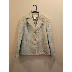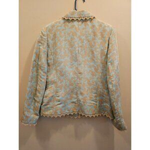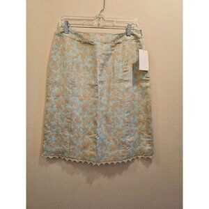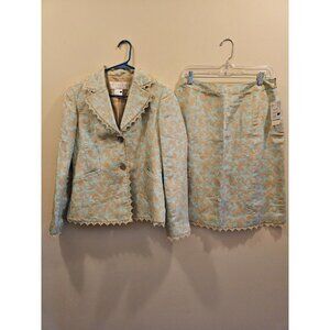 NWT Women's Doncaster Linen/Silk Butterfly Suit Size 8 Aqua/Beige Summer 2005. The jacket and skirt are both 66% Linen and 34% Silk and both are lined. The jacket has lace trim. The skirt has a side zipper. The approximate measurements for the jacket when laid flat are 19" armpit to armpit, 17" at the waist and 25" long from the top of the shoulder to the bottom hem. The approximate measurements for the skirt is 30" waist and 23" long from waist to bottom hem.
