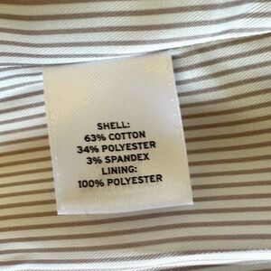 Discover timeless style with this NWT Women's Dress Jacket by HALOGEN. This beige blazer is crafted from a comfortable blend of 63% Cotton, 34% Polyester, and 3% Spandex, ensuring durability and a perfect fit. Its chic design features a button front closure and #LongSleeveBlazer structure, providing a sophisticated look. The #BeigeBlazer includes two practical front pockets and a stylish striped lining for added flair.