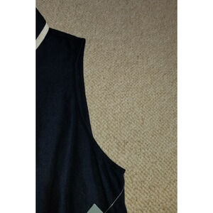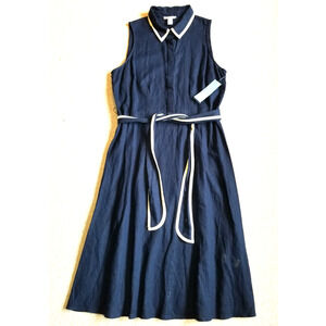 Women's Dress-LONDON TIMES-Amazing women's navy blue and white linen blend 'Polished Preppy Classic Belted Shirt' dress. Dress has a rounded neckline with a collar, front 1/2 button and side zipper closures, two front pockets, sleeveless and is not lined. 55% Linen, 45% Rayon. Marked Size: 14 (Underarm-to-Underarm= 19 1/2 inches, Length= 46 inches). Excellent condition. Non-smoking home. Thanks for looking!