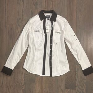 Brand new with tags! Classic and versatile “The Essential Shirt” from Express. Crisp white with black accents, button front, collared neckline, and long sleeves. Perfect for workwear, business casual looks, or dressing up with jeans for a chic style.