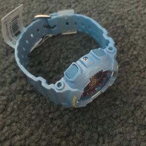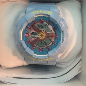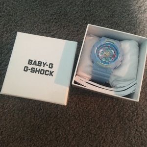 BRAND NEW Women's BabyG Casio G-Shock watch. Waterproof, dust proof, drop proof. New in box with tags and instructions manual. Light blue color with pink and yellow details. Adjustable band.