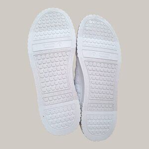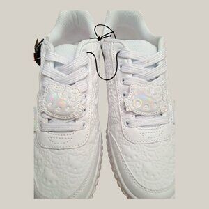 Designed in a sleek white color with embossed details featuring hearts and Hello Kitty's iconic face all over. The tongue showcases a holographic patch that adds a unique and shiny touch to the shoes. Made with durable materials and cushioned interiors for everyday comfort – perfect for Hello Kitty fans and collectors alike.