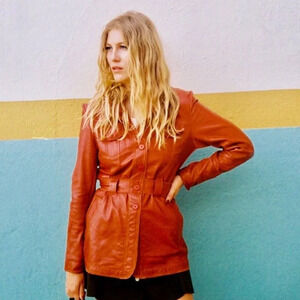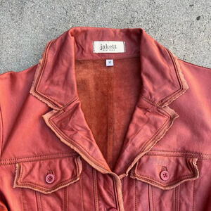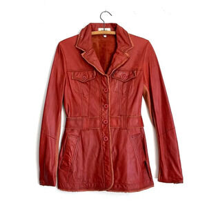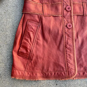 NWT Women's Jakett New York Carmen Habanero Leather Jacket. Buttery soft leather. Long utility jacket with cargo pockets and adjustable belted waist. Intentionally distressed with frayed edges for a vintage look. Button closures, wire inserts in collar, lapels, pocket flaps and cuffs for shaping as well as knit detailing along the sleeves. Style No. 50108372. Size Extra Small.