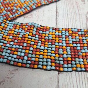 The NWT Women's Lake Shore Drive Accessories Multi-color Glass Beads Belt is a stylish and colorful accessory designed for a fashion-forward woman. This geometric patterned belt is made of colorful glass beads with a wooden hardware accent, adding a unique touch to any outfit. The belt is size L with a 2" width, suitable for a waist size of 38-39 inches. It features a stretchy fabric for comfort and a buckle closure for a secure fit. Made in Indonesia, this belt is perfect for adding a pop of color and flair to any wardrobe.