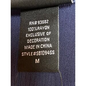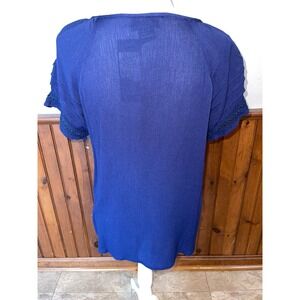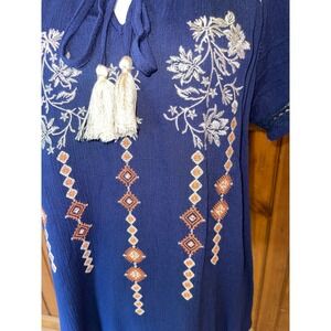 This top is gorgeous! It is very light weight and perfect for Spring and Summer. It is a nice navy blue color with a tassel detail in the front with a keyhole. The embroidered detailing also makes this top pop! It is a womens size medium.