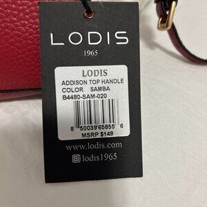 NEW WITH TAGS - PURCHASED - NEVER USED, original packaging, duster bag and tags all included inside the purse. Women's designer red leather, Lodis purse. Can be worn cross body or on shoulder. Great looking leather buckle on front, snap closure, adjustable strap, pegs on bottom from standing up. Multiple compartments inside. Duster bag can be removed to store purse in when not in use. Measures 6 1/2" inches wide and 6" inches tall - fabulous looking little purse - great for when you only need a few things. Firm on prices as it's pristine, unused, with original packing, duster bag and all tags attached.