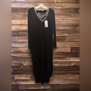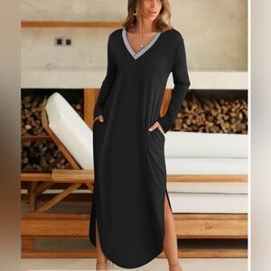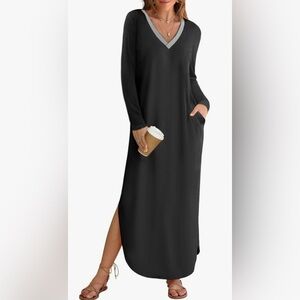NWT Women's Long Sleeve Loose Casual Maxi Dress V Neck Trendy Split Black Size M