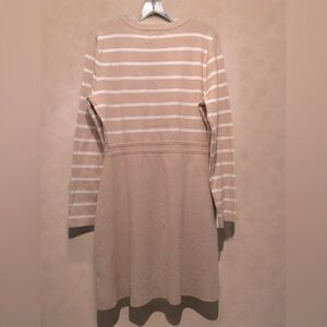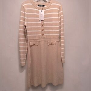 NWT Women's Long Sleeve Tan/ White Striped Button Crew Neck Sweater Dress M