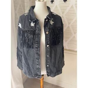 Boutique Women’s Medium Oversized Distressed Black Denim Star Sequin Fringe Jacket