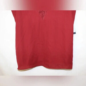 This is in a deep red color way with adjustable straps and a front floral lace detailing on the chest.