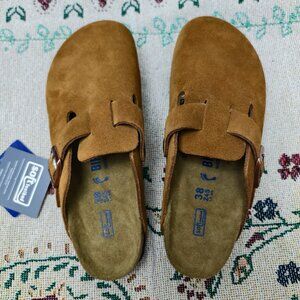 Brand new authentic Birkenstock Boston clogs in luxurious mink suede, designed for narrow/medium width feet. Never worn with original tags attached - includes official shoe box for premium presentation.