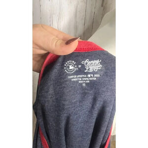 The Campus Lifestyle women's ringer T-shirt in size XS is a casual, solid blue top made from a blend of cotton and polyester. It features a crew neck and short sleeves, with embroidered accents adding a touch of detail. Designed for a regular fit, this breathable and soft T-shirt is ideal for spring outings and casual occasions, such as sports events or a day out. Manufactured in the United States, it is machine washable for easy care. The item is new with tags.