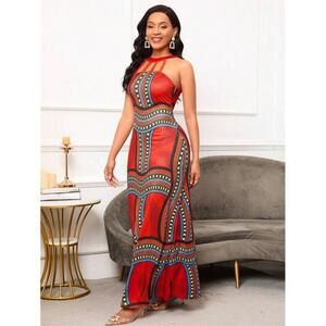 Step out in style with this vibrant multicolor maxi dress for women. Featuring a sleeveless halterneck design, this dress is both comfortable and eye-catching. Perfect for special occasions or summer outings.