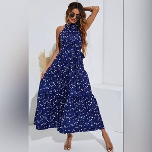 NWT Women's Night Sky Halter Neck Maxi Layer Dress In Navy & White little stars