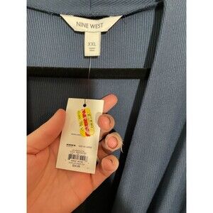 NWT. Women's Nine West dark blue sleeveless blouse in size XXL. It is designed for women and features a stylish wrap design, making it a versatile and elegant addition to any wardrobe. The top is perfect for those looking for a flattering and comfortable blouse in a darker shade of blue, suitable for various occasions and outfits.
