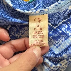 NWT. Women’s. OP bikini bottoms with multicolor blue geometric print. Size Large 11/13.
