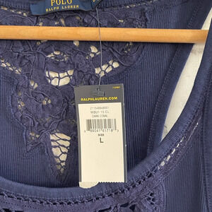 NWT! Women’s. POLO Ralph Lauren blue tank top. Crochet back and front details. Size Large.