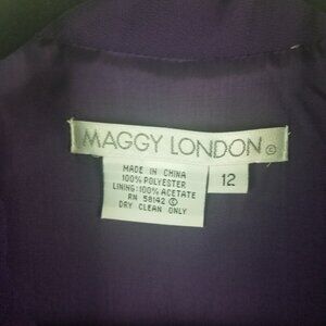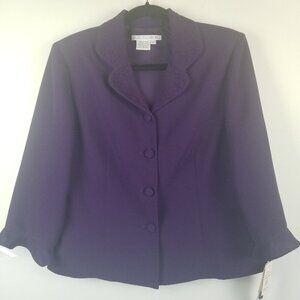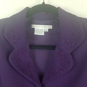 Maggy London plum/Purple blazer with embroidered collar, button front with shoulder pads. Lined. Shell 100% Polyester and lining 100% Acetate. Pit to pit 21" and length 22.5", sleeve length 19". NWT.
