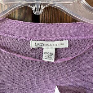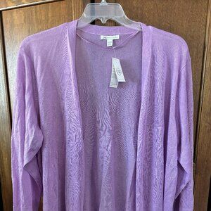 Very pretty new sweater from Cato. The color is lavender. It's open front and very lightweight. The sleeves measure 22 inches and the length is 26 inches.