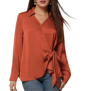 NWT Women’s Plus Sized Satin Wrap Blouse Women's Long Sleeve Elegant Tie Waist