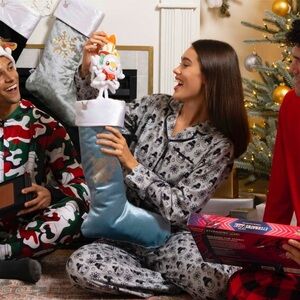 The first partner Pokémon of Kanto are ready for the cold! A great way to stay warm with a bit of Pokémon flair during the colder months, this button-up pajama set is decorated with Bulbasaur, Charmander, and Squirtle looking happy and cozy in their hats, surrounded by snowflakes!