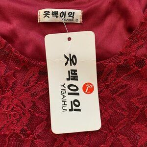 This is a new with tags (NWT) red floral lace tunic top for women in size L (runs small). It features a scoop neckline, long sleeves, and a pullover closure. The bodice top is lined, collarless, lightweight, and has a stretch to it. It is suitable for parties, business, and various seasons. The design is feminine, whimsical, and ethereal, perfect for special events or cocktail parties.