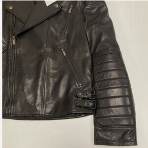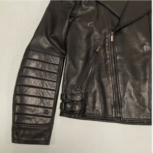 Nice skull design on the back made out of small metallic wires. Super cool technique! Its incredible soft since its made from lamb and not leather but looks like leather. On the forarms there is light padding. On the sides there are buckle straps to adjust the fit. It measures overall 24 1/2" long and from armpit to armpit 20". I belive this is a women's fit jacket. Please see all pics.