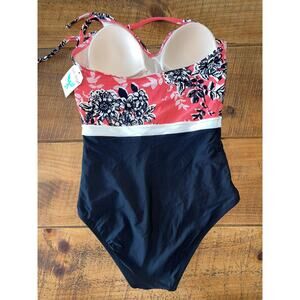 NWT Womens Sea Angel Coral Peach Black Floral Halter One Piece Swimming Suit M