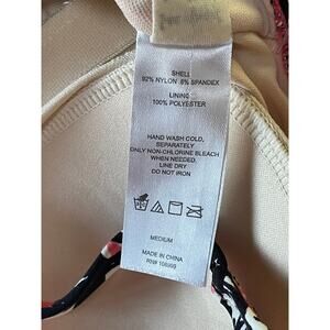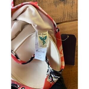 This bathing suit is brand new with tags! It is a halter tie bathing suit, and it is padded. The pads are not removeable. It is a coral/peach color with a black and white floral design. The fabric is SO soft!! Measurements are in photos, but I believe this would also fit a size small.