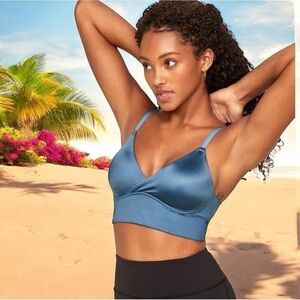 Discover comfort and style with the NWT Adore Me Kali Contour Athletic Sports Bra in stunning blue. Designed for #low-impact activities, this sports bra features a sleek sheen micro fabric and surplice #trianglecups for a sexy look. Enjoy the convenience of a no-closure pullover design and adjustable straps to find your perfect fit.