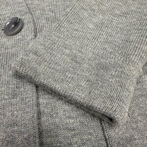 * STYLE- Oversized Gray Lamb's Wool Blend Cardigan Duster Sweater, 2 Front Patch Pockets, Dry Clean, Notch Collar, Split Hem, Folded Cuff, One front button, Extra button. Would make an excellent gift.