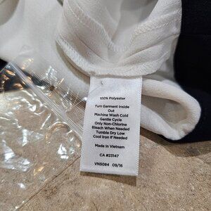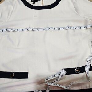 NWT Women's Talbots Career Top 3/4 Sleeve Off White/Navy Blue Trim Size M. 100% Polyester. Has keyhole neck at the back. Laid flat measures approximately 20" armpit to armpit and 24" long from top of shoulder to bottom hem. Smoke free and cat friendly home.