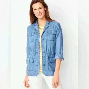 Brand new with tags. This lightweight Talbots casual jacket is a polished wardrobe essential, perfect for layering in spring, summer, and early fall. Made from a breathable cotton-linen-Tencel® blend, it features a cinched-back waistband with decorative belt detail for a flattering fit, a notched foldover collar, antiqued nickel buttons, and four functional patch pockets. Versatile and travel-ready, it pairs effortlessly with denim, trousers, or dresses for a relaxed yet elevated everyday look. Ideal for work, weekends, or vacation.