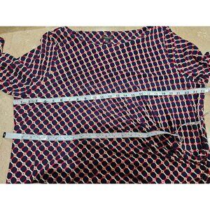 NWT Women's Talbots Woman Petites Geometric Faux Wrap Midi Dress Size 3XP. 3/4 Sleeve. 93% Rayon and 7% Spandex. Multi-color - Blue, Red, White and Tan. Laid flat measures approximately 24.5" armpit to armpit and 43" long from the top of the shoulder to the bottom hem.