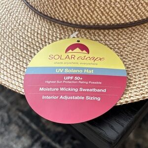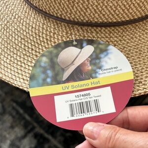New with tags! Stylish and comfortable tan straw hat , featuring a chic brown band. Perfect for sunny days. UPF 50+