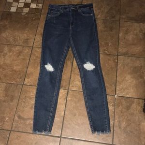 Brand new medium washed distressed blue jeans. Zipper & stud button closure. Comfortable stretch with 2% spandex. Ripped distressed areas on knees, under front right pocket, & on right back pocket. Pic8 shows the hems of legs are distressed & fringed. Real cute! Sz 6/28.