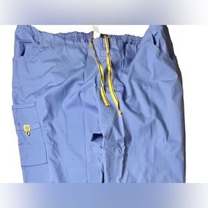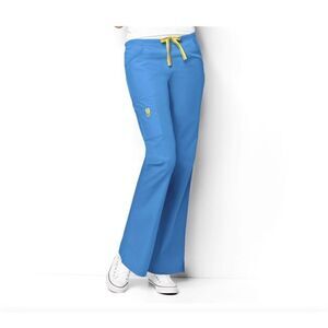 NWT Wonderwink Women’s Blue Romeo 5026T Fit Flare Cargo Scrub Uniform Pants 3X TALL. Classic rise, slim through the hips and thighs, fitted just at the knee before flaring at the leg. Very lengthening and body slimming. Features: 6 pockets. Half back elastic waistband. Convertible drawstring - placement allows drawstring to be tucked inside the pant or displayed outside of it. Signature ID bungee loop. 65% Polyester/ 35% Cotton poplin blend provides durable softness for all day comfort. Machine washable. Malibu blue.