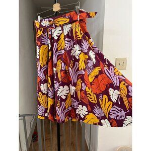 This vibrant skirt features a bold floral pattern in rich purple, orange, and yellow tones. Its belted waist and pleated design offer a flattering silhouette.