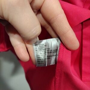 This Worthington women's shirt in size 8 features a classic and timeless design, perfect for both casual and business occasions. The shirt is made from a stretchy and comfortable blend of polyester, spandex, and cotton, ensuring a comfortable fit all day long. The shirt has a collared V-neckline and button closure, with long sleeves and a solid pattern in a beautiful fuchsia pink color.