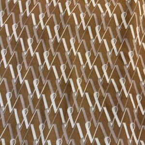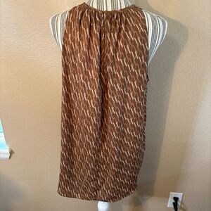 Sleeveless blouse in a camel Brown color with a unique pattern in tan and cream. The Winona Geo pattern by Worthington with what looks like a recurring “W”.