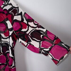 This Worthington blouse showcases a striking floral pattern in vibrant pink and black colors. Its sheer polyester material adds an elegant touch, making it suitable for professional settings. The large size ensures comfort and style, while the design complements various wardrobe choices, offering versatility and sophistication.
