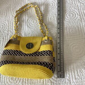 NWT Woven Yellow & Brown Striped Straw Shoulder Bag With Silver Chain Strap & Tu