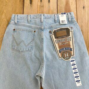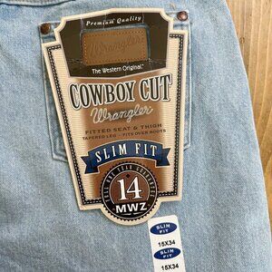 NWT Wrangler Cowboy Cut Slim Fit Jeans Tapered Leg fits over boots 15x34 Bleach